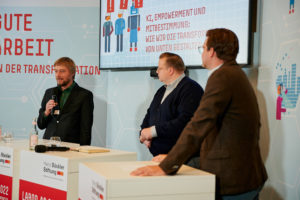 Lars Schatilow, Founder of „Human Friendly Automation“, IBM Deutschland GmbH; Barbara Langes, Wissenschaftlerin, ISF München; Martin Födisch, Referent für digitales Changemanagement, Bundes­agentur für Arbeit; Moderation: Oliver Suchy, Leiter der Abteilungen Grundsatz und Gute Arbeit, DGB-Bundesvorstand