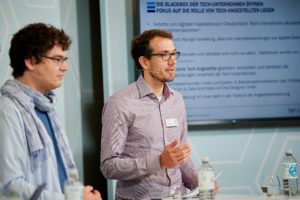 Alexander Ziegler, ISF München; Johannes Katzan, Koordinator, Transformations-Enabler und Experte für Angestelltenarbeit, IG Metall Niedersachsen und Sachsen-Anhalt; Jan Dittrich, Tech-Angestellter, UX-Designer, Wikimedia Deutschland; Yonatan Miller, Tech-Angestellter, Founder Berlin Tech Workers Coalition; Moderation: Setareh Radmanesch, Kooperationsstelle Wissenschaft und Arbeitswelt am F.A.T.K. der Universität Tübingen