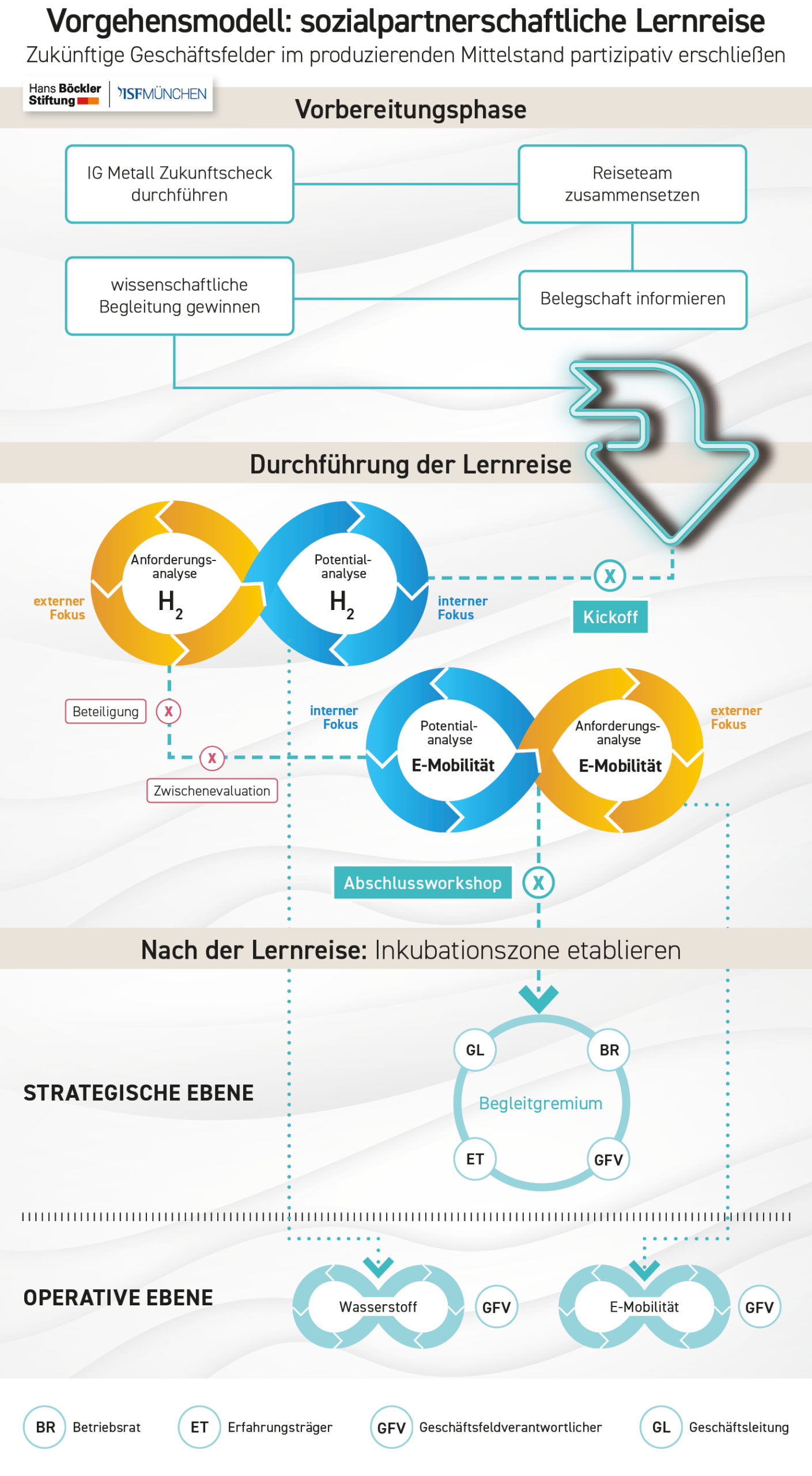 Ziel des praxisorientierten Projekts war es zum einen, einen mittelständischen Automobilzulieferer bei der Erschließung neuer Geschäftsfelder für neue Mobilitätsformen zu begleiten. Bisher produzierte das Unternehmen hauptsächlich hochpräzise Drehteile für den Antrieb mit Verbrennungsmotoren. Zum anderen sollte aufbauend auf die Erfahrungen im Projekt ein Vorgehensmodell für die sozialpartnerschaftliche Erschließung neuer Geschäftsfelder im produzierenden Mittelstand entwickelt werden. Im Zuge dessen erarbeitete ein Kernteam aus Sozialpartnern und Beschäftigten des Unternehmens mit der Unterstützung der Projektpartner einen Überblick über mögliche Zukunftsprodukte sowie konkrete Transformationsschritte zu deren Erschließung. Dazu wurde eine Sozialpartnerschaftliche Lernreise Zukunftsprodukte durchgeführt, die verschiedene Workshop-Formate u.a. Potenzial- und Anforderungsanalysen zu Wasserstoff & Brennstoffzelle und E-Mobilität mit Akteuren aus diesen Geschäftsfeldern sowie Formate zur Beteiligung der Belegschaft beinhaltete.